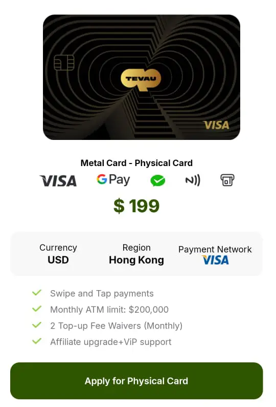 - Apply and manage Tevau Metal/Plastic cards directly from phone