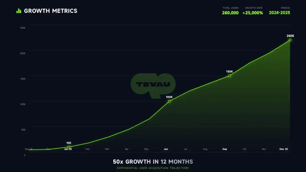 - 260,000+ ผู้ใช้งานที่ลงทะเบียน (จาก 4,413 คน ในเดือนพฤศจิกายน 2024 → 260,000 คน ในเดือนธันวาคม 2025; เพิ่มขึ้นประมาณ 50 เท่า เมื่อเทียบกับปีก่อน)